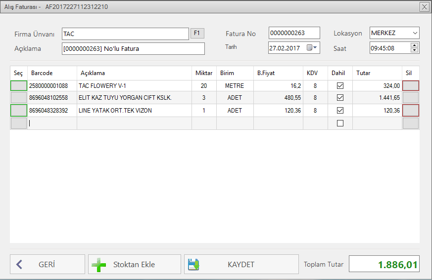 - Alım satımdaki KDV kısmı otomatik hesaplamaktadır.